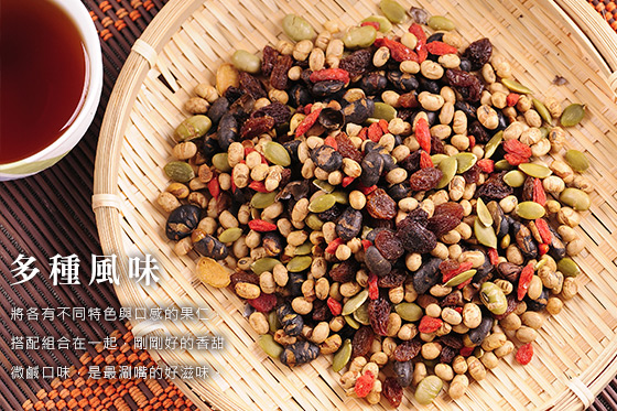 香甜的枸杞、果香四溢的葡萄乾,將口感變得更柔和,酥脆的黑豆、黃豆與南瓜子,增添口感與天然香氣,不添加防腐劑與色素,每一口都是養生好味道。